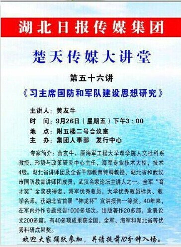 9月26日下午三点,“国防教育讲师团进媒体、读者网友进军营”活动在汉启动。启动仪式上,省国防教育讲师团成员、知名军事专家、海军工程大学教授黄友牛,以“习近平主席的军事战略思想研究”为题作了专题讲座。中共永利集团304第一党支部副书记赵义等三名党员同志和入党积极分子参加了本场讲座。