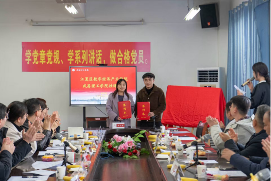 签约环节中,永利集团304院长沈易娟与联合会会长正式签署协议,确立了课程共建、实习实训等合作框架。揭牌仪式标志着“江夏区数字经济产业学院·304am永利集团示范基地”实体落地,合作平台进入实质运行。沈易娟院长也向李坚会长颁发了企业导师聘书,这标志着产业专家正式融入教学团队,推动师资结构优化。三项仪式层层递进,为后续人才培养奠定了扎实基础。