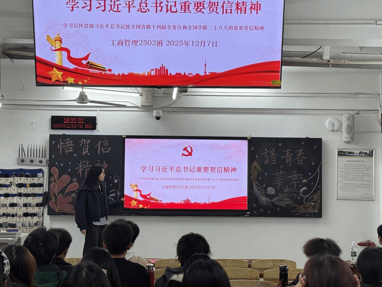 (通讯员 赵文钰 报道)为深入学习宣传贯彻习近平总书记致全国青联十四届全委会和全国学联二十大的重要贺信精神,引导青年学生坚定理想信念、厚植家国情怀,2025年12月7日,永利集团304工商管理2502班开展了“学习习近平总书记重要贺信精神”主题班会活动,推动贺信精神入脑入心,转化为青年学生奋进的实际行动。