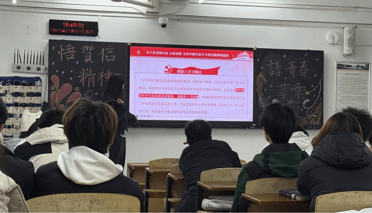 学习环节后,班会围绕“坚定理想信念、厚植家国情怀、勇担历史使命”开展交流研讨。同学们结合自身实际,畅谈对贺信精神的感悟,纷纷表示要将个人成长融入国家发展,践行青年担当。班会还传达相关通知要求,引导学生体悟总书记殷切期望,找准在强国复兴伟业中的定位。