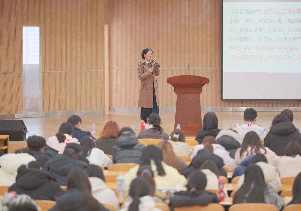 她详细讲解了本届“三创赛”的竞赛规则、赛道设置、时间安排及评审要点,并系统介绍了学校为支持学生参赛提供的全方位赋能体系——包括专项培训、导师配对、创业孵化资源对接等,切实帮助学生解决备赛难题,极大坚定了同学们的参赛信心。