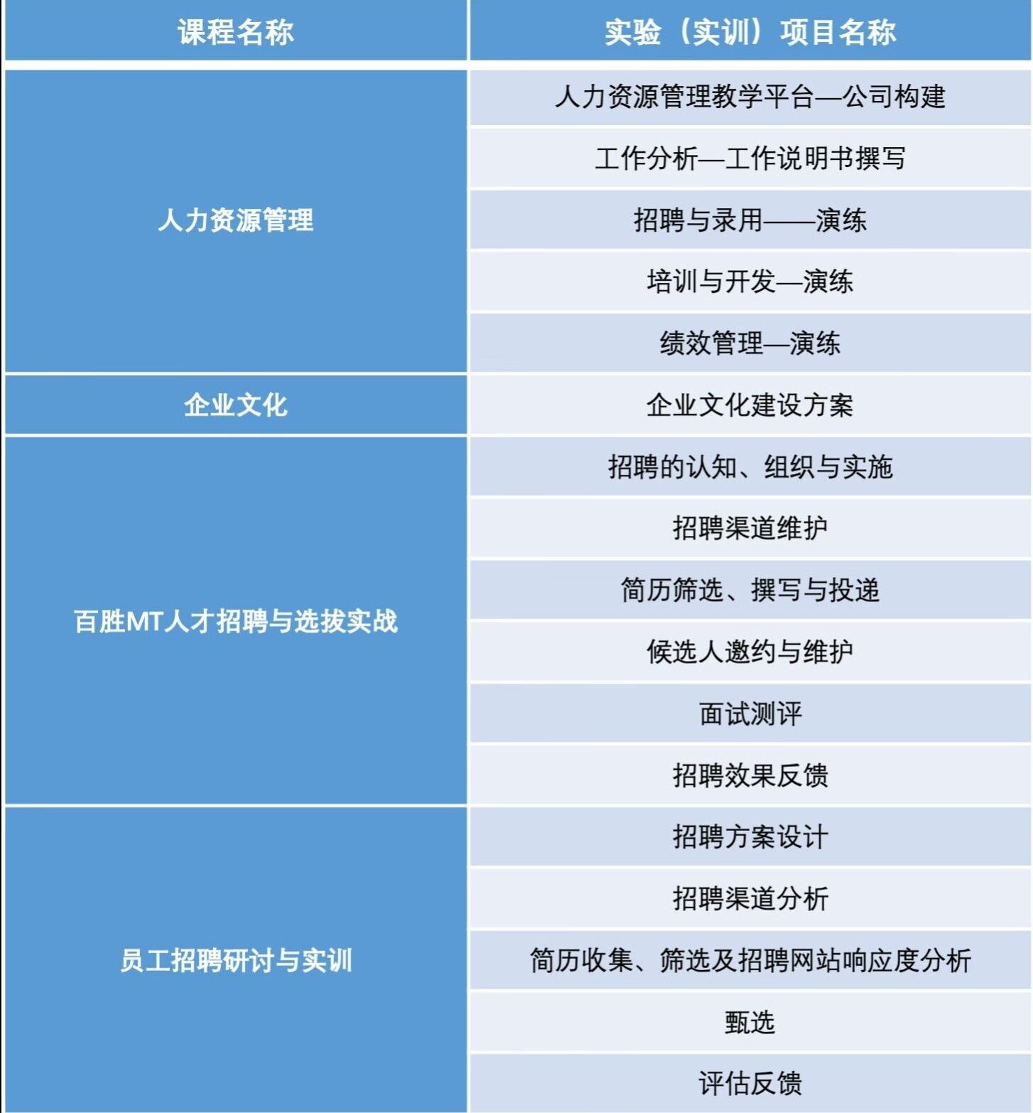 其中,人力资源智能仿真与竞赛对抗软件主要满足《人力资源管理》、《招聘与录用》、《人员素质测评技术与方法》、《百胜MT人才招聘与选拔实战》课程的实训需求,特别是专业校内赛事的举办均需用到该软件;绩效管理专业技能实训软件主要用于满足《绩效方案设计研讨与实训》课程的需求;薪酬管理专业技能实训软件主要用于满足《薪酬方案设计研讨与实训》课程的需求。
