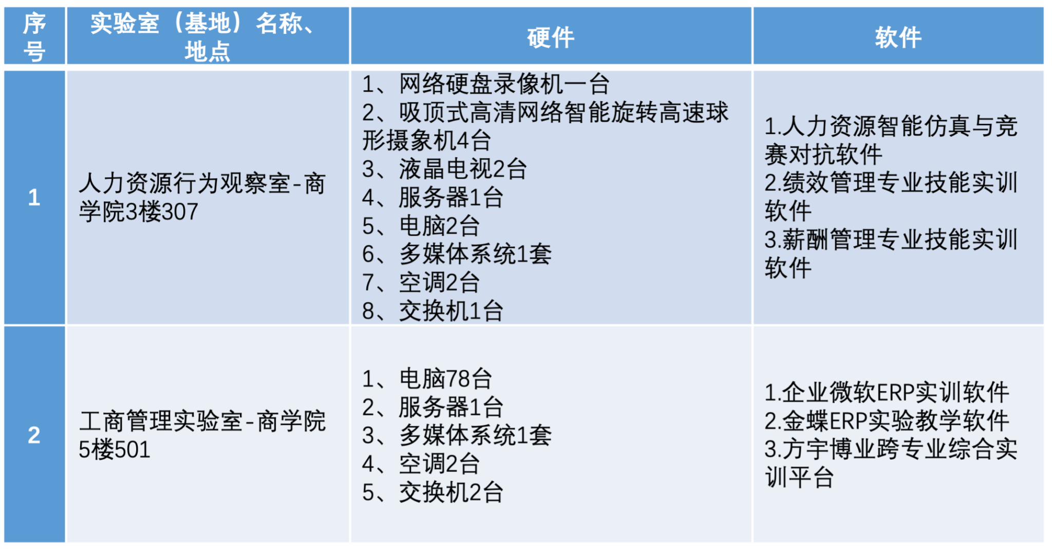 人力资源行为观察室、工商管理实验室自建立以来,人力资源管理专业的大部分实训课均开设在这两个实验室。实验室的软硬件基本能满足本专业的实训要求,软硬件设备使用充分。