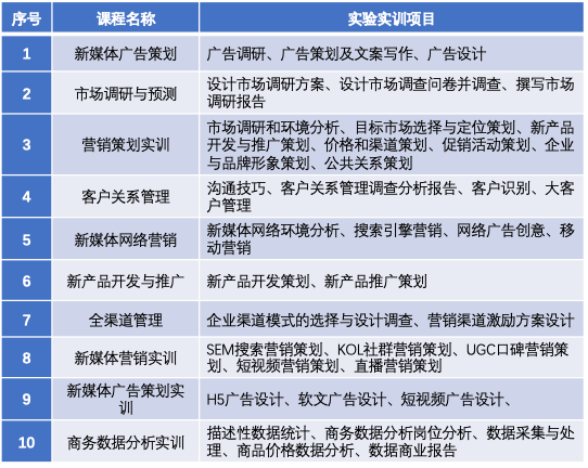 市场调研与预测、新媒体网络营销、商务数据分析实训、营销策划实训、客户关系管理、新媒体广告策划实训、新产品开发与推广、新媒体营销实训等