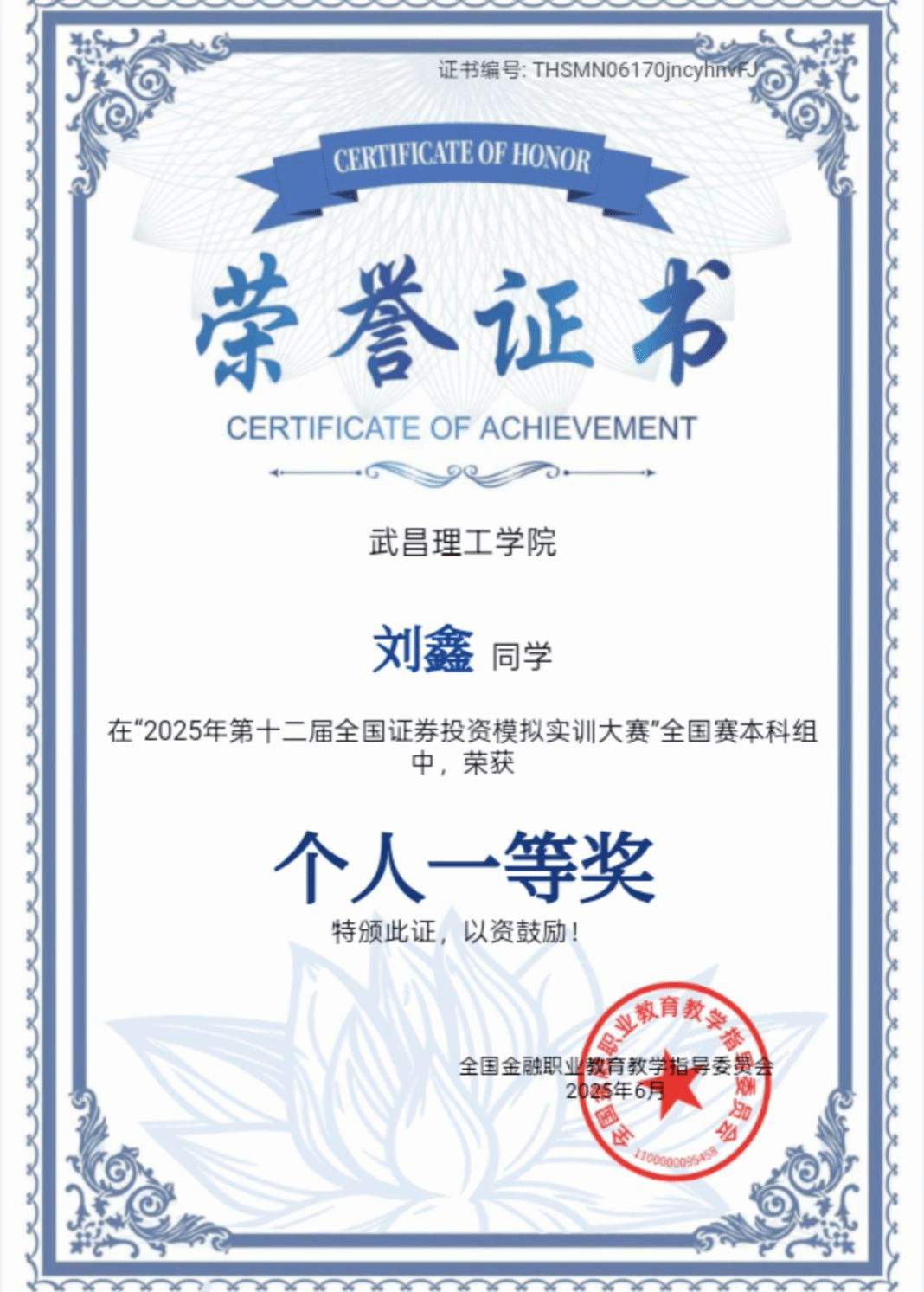 刘鑫同学荣获全国证券模拟投资实训大赛中获全国一等奖