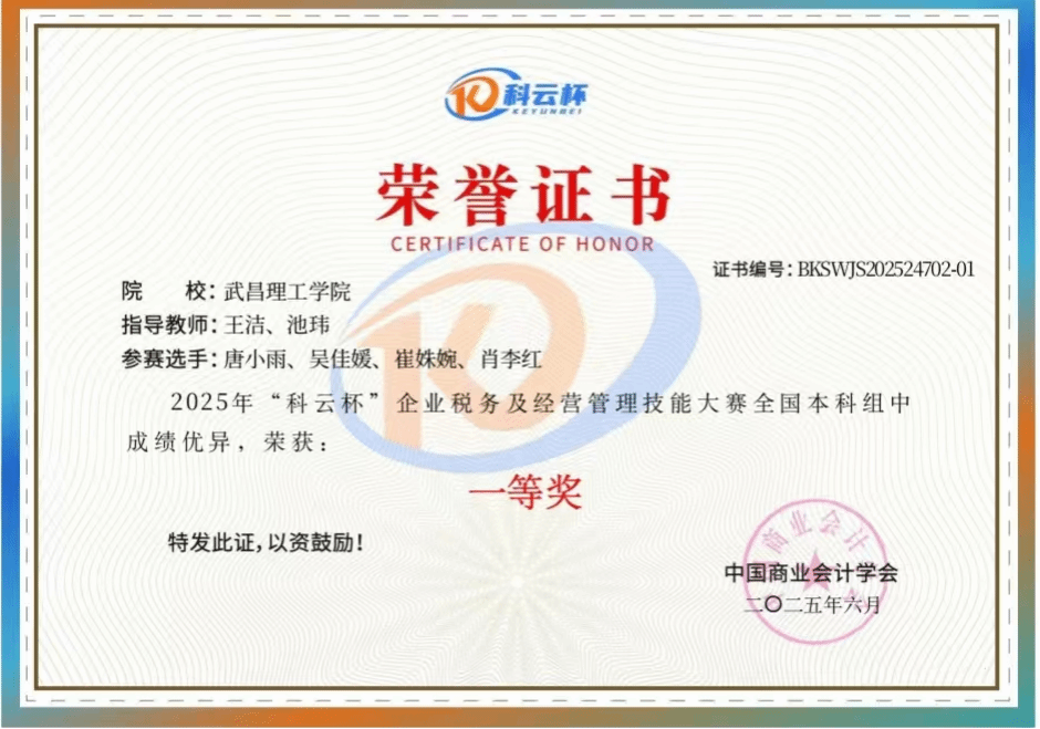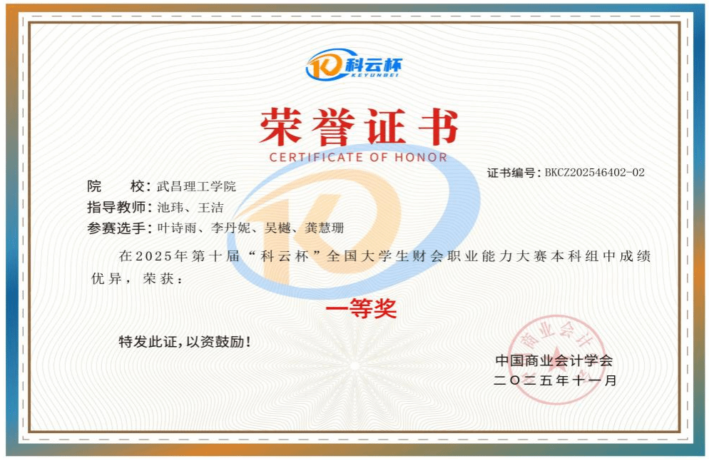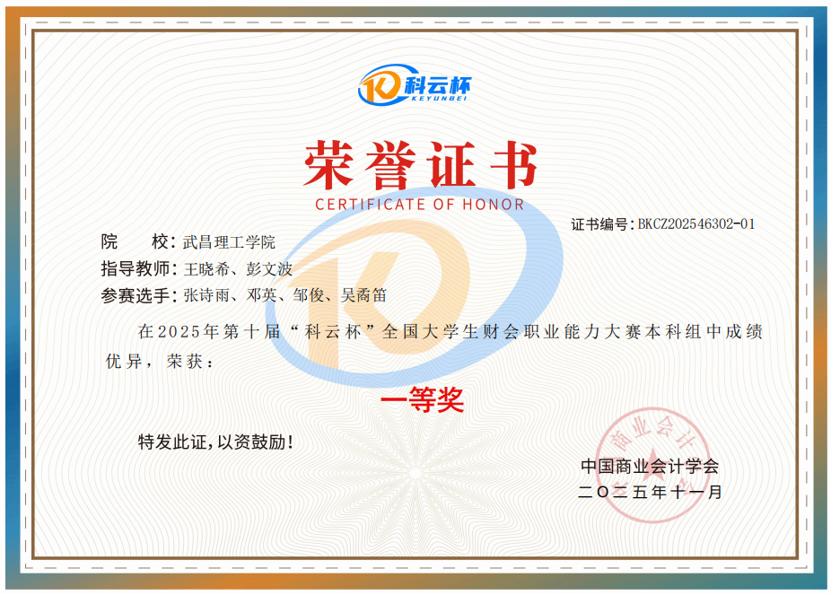 张诗雨团队荣获“科云杯”全国大学生财会职业能力大赛本科组一等奖