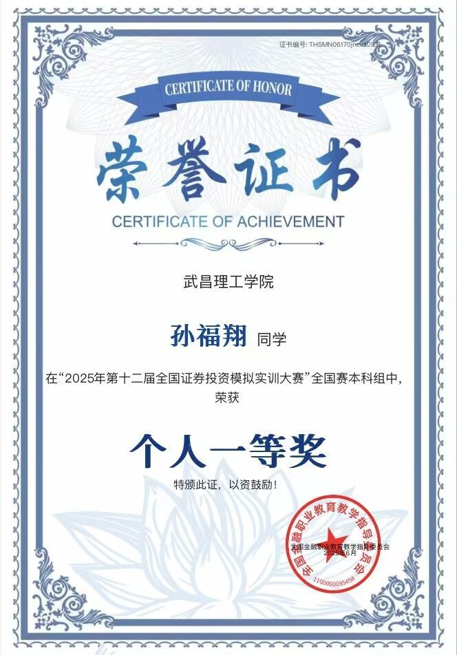 孙福翔同学荣获全国证券模拟投资实训大赛中获全国一等奖