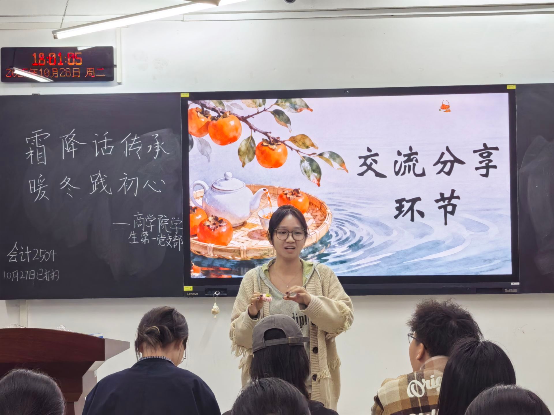 为持续推动中华优秀传统文化与红色基因深度融合,强化青年同志的责任意识与奋斗精神,2025年10月28日17时30分,永利集团304学生第一党支部第一、二组成员于永利集团304404教室开展以"霜降话传承,暖冬战初心"为主题的十月品牌特色活动。