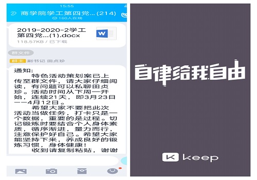 自接到总支通知,支委们就立即展开了讨论,大家集思广益,提出了许多的建议与想法,因为现在这个特殊时期,足不出户齐抗疫情已成为趋势,但生命不息,运动不止,我们要用积极进取,逐步实现理想、本领与担当,才能为人民,为国家,为党实现不可磨灭的价值。最后支部委员一致同意将运动健康作为此次活动主题,决定在这个特殊的长假中开展“生命不息,运动不止”特色活动。随后,副书记田贞珍及时写出了策划案,并与支委们讨论了策划案,大家都积极为此次活动的成功开展提供自己的想法,将策划案更加“细节化”,在保证策划案无误后,副书记才将其发到支部群里。支部所有同志从2020年3月23日开始第一天打卡Keep,持续21天,可以根据自身情况选择适合自己的运动项目并每天打卡运动,支部同志看过策划案后都表示:“该活动是很有意义的,在这个特殊时期保持运动既是对自己的健康负责,也更加能体现我们学生党员的积极性”。大家都积极下载软件,为保证活动的顺利进行,大家提前一天对软件进行试用,支部委员们也积极、热心的解决同志们出现的各种状况。