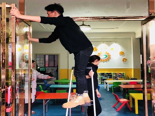 当天中午十二点半23名成员到达小葵花康复中心,分为两组,一组成员准备饺子馅,一组成员清扫康复中心六层楼,余阳书记在和院长了解小朋友的情况,此时的小朋友还在午睡,志愿者们的动作很轻。因为前期不知道小朋友们不吃香菇,原计划的香菇鲜肉馅需要替换,重新购买了白菜。约一个小时左右,三大盆饺子馅搅拌均匀搬上桌,23人或在厨房收拾卫生,或在为孩子们准备气球,但最多的还是围坐在桌前为小朋友准备饺子。23人来自中国各地,湖北河南山东青海,南北东西包饺子的手法各不一样,包出来的形状也各异,在一起一边用自己熟悉的手法快速捏按,也会彼此之间相互学习新手法,王进昆同志粗略数了一下他们的“战果”,1005个饺子。