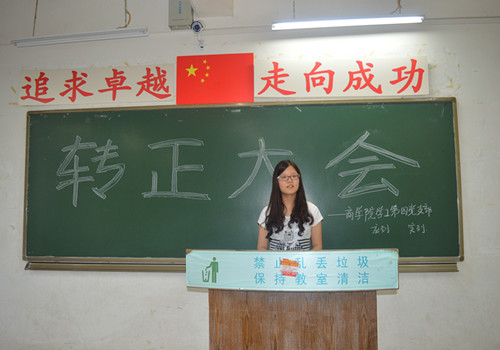 在本次转正预备党员中,毕业生沈红燕给大家分享了自己的实习经历,同时谈到了:“在工作的时候要学会调节好自己的时间,工作中压力是有的,但要学会把工作压力化为动力。”并且她还介绍说:“我们找工作,一定要挑适合自己的工作,并且大学生刚出校门找工作,切记不要眼高手低,踏踏实实,一步一个脚印。”