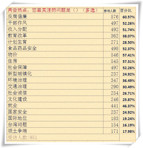 在“两会热点,你最关注的问题是什么?”问卷调查中,调查显示,大学生最为关注的十个话题依次为:反腐倡廉、物价、住房、食品药品安全、社会保障、干部作风、收入分配、就业、教育改革和环境治理。其中,有60.57%的大学生关注“反腐倡廉”,57.41%的大学生关注“物价”, 57.31%的大学生关注“住房”,而关注就业的占46.37%,关注教育改革的占38.07%。