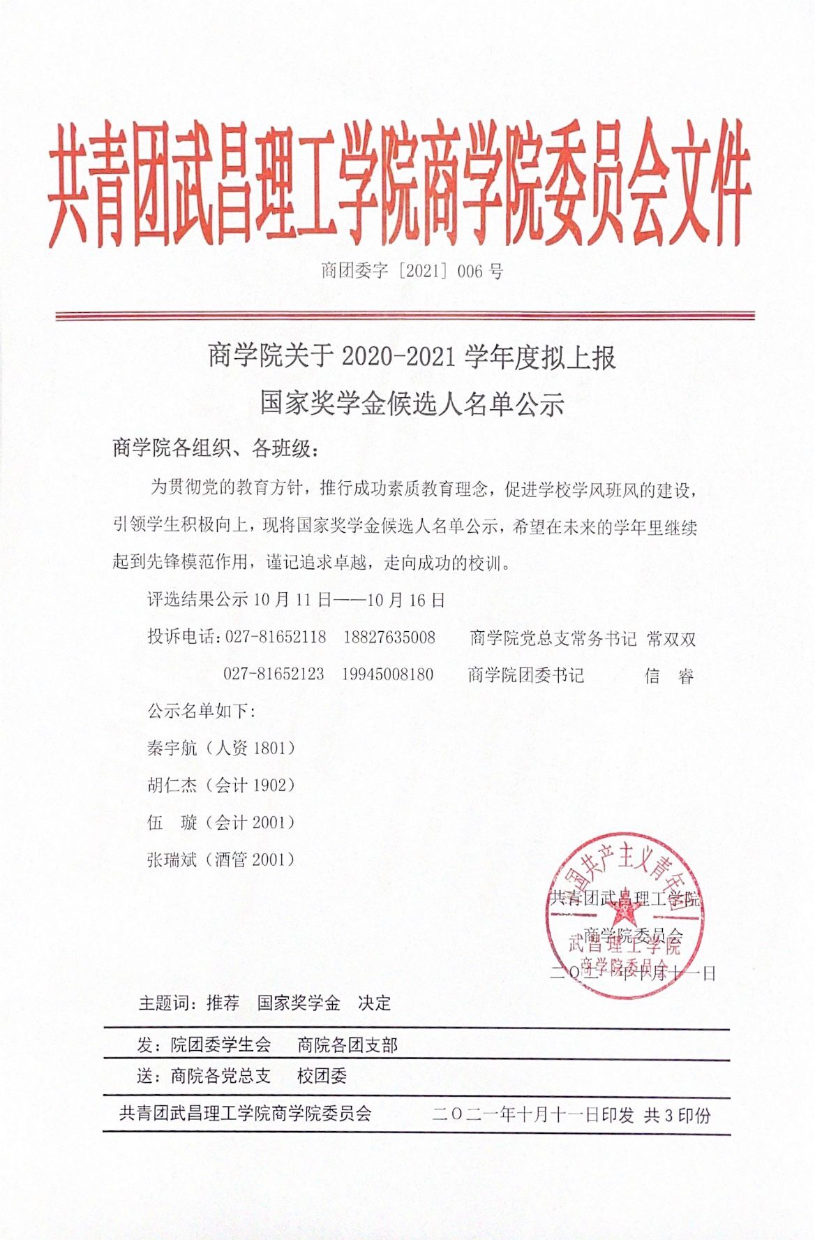 永利集团304关于2020-2021学年度拟上报国家奖学金候选人名单公示