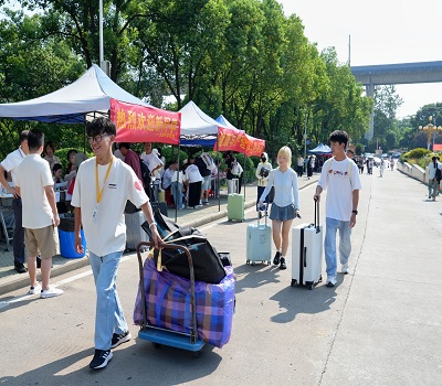 尤为值得一提的是,志愿者们在搬运行李的过程中展现出了极高的责任心和耐心。他们不仅确保了行李的安全搬运,与此同时向新生介绍校园一卡通的功能和使用方法,并亲自带领他们熟悉校园的各个重要地点,包括学院楼、食堂、图书馆以及菜鸟驿站等。这种贴心服务让新生们在短时间内就能对校园有一个全面的了解,为他们的大学之旅铺设了温馨而坚实的第一步。