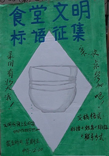 据悉,本次征集活动时间截止于11月11日,目的在于建立良好的食堂文明。前期了解到,学校食堂还存在一些插队、乱扔饭菜、喧哗大叫等一些不文明行为,而建立文明的食堂就餐,则需要同学们共同努力,因此开展了此次的标语征集活动。首先,同学们将拟好的标语发送到生活部专用邮箱,并填写好姓名、班级、联系电话,然后由生活部进行评选,优秀的标语被录用后,会有一定的奖励,希望同学们涌跃投稿,展现自我才华。