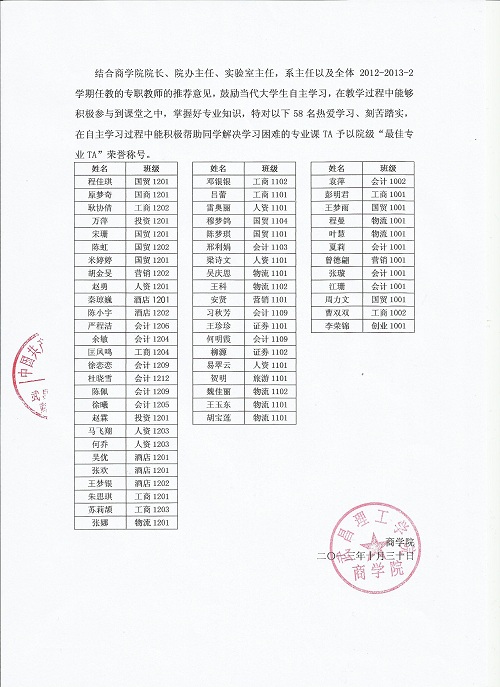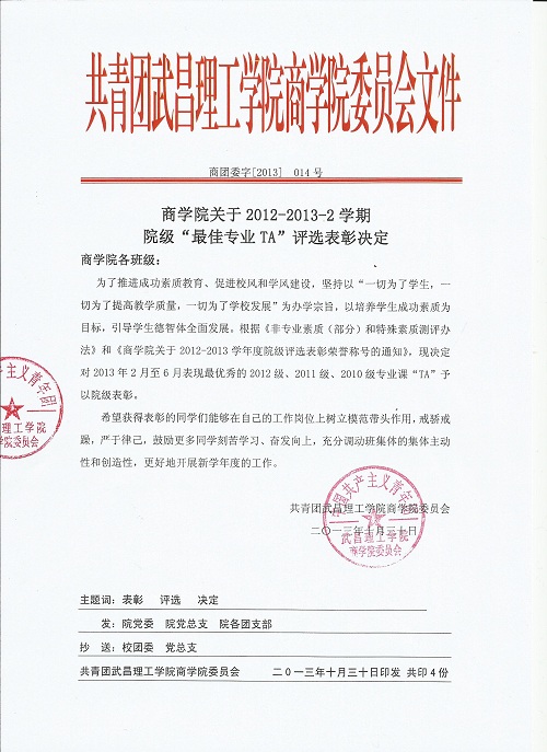 永利集团3042012~2013-2学期院级“最佳专业TA”评选表彰决定