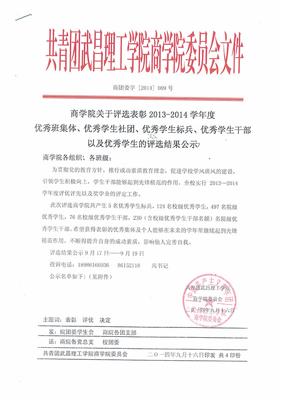 永利集团304关于评选表彰2013—2014学年度优秀班集体、优秀学生社团、优秀学生标兵等的评选结果公示