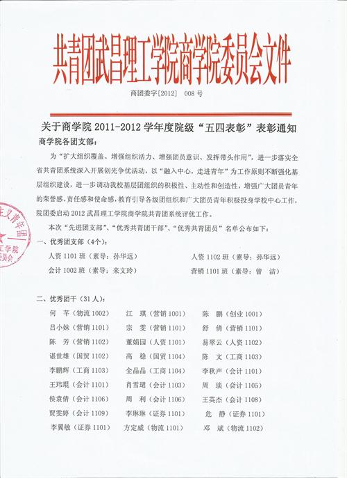 永利集团304关于2011-2012学年度院级“五四表彰”表彰通知