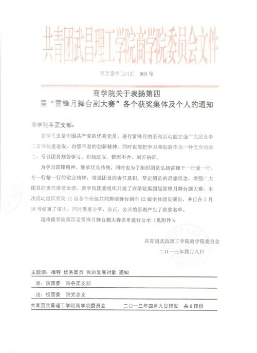 永利集团304关于表扬第四届“雷锋月舞台剧大赛”各个获奖集体及个人的通知