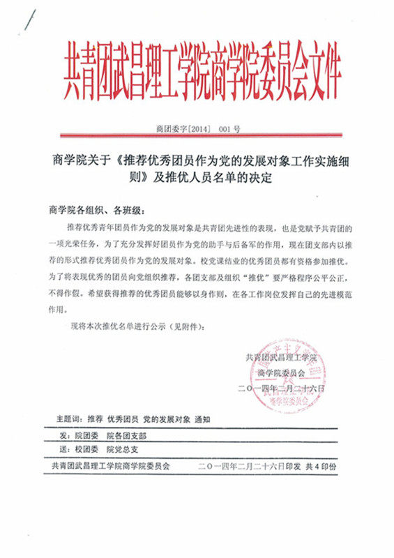 永利集团304关于《推荐优秀团员作为党的发展对象工作实施细则》及推优人员名单的决定