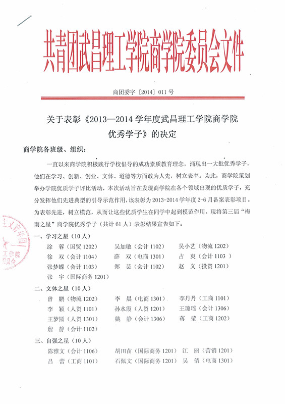 永利集团304关于表彰《2013—2014学年度永利集团304优秀学子》的决定