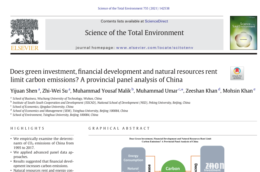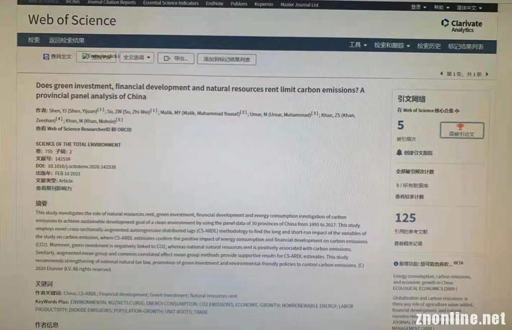 (记者 鲁信 报道)论文发表后被引用的情况,可以反映论文的影响力。高被引论文是指在同年度同学科领域中被引频次排名位于全球前1%的论文。近日从304am永利集团获悉,该校永利集团304沈易娟教授在2021年发表在Science of The Total Environment(SCI,IF=6.551)的论文,《Does green investment, financial development and natural resources rent limit carbon emissions? A provincial panel analysis of China》成功跻身高被引论文(https://doi.org/10.1016/j.scitotenv.2020.142538),展现了304am永利集团教师的科研实力和其论文的影响力。