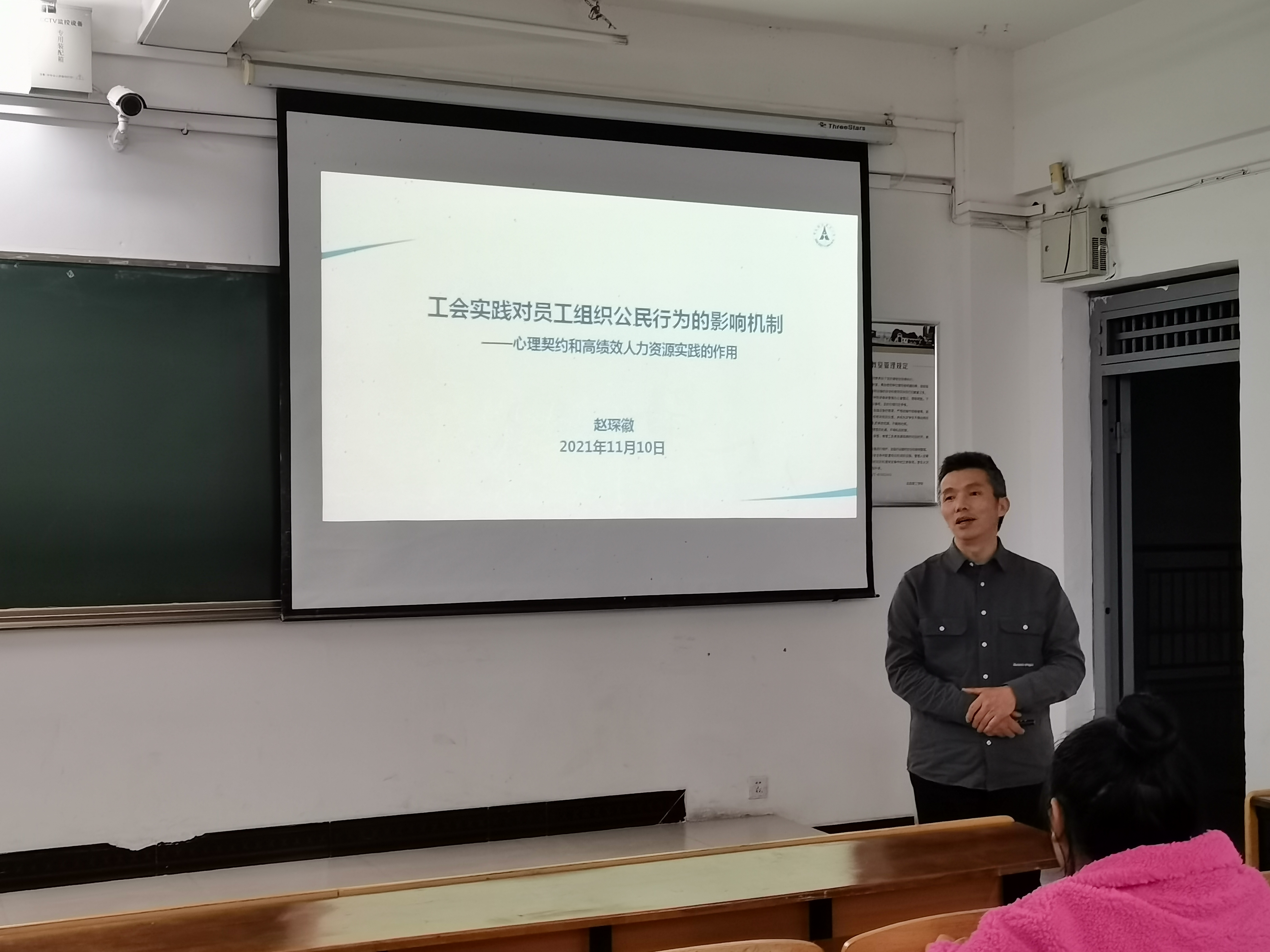 讲座由人力资源管理系主任易晓芳主持。通过简单的寒暄同学们逐渐与赵教授熟络起来。讲座从组织工会这一话题引入,首先讲述了国内外工会的不同作用与运作机制,讲述了中国情境下工会在人力资源管理中的重要作用,而后赵教授重点以中国工会的实践、高绩效人力资源实践为背景,结合心理契约、社会交换理论和资源保存理论提出了相关理论假设与研究模型,提出了三点管理启示:第一:企业管理者需要重视工会在协调劳动关系、关怀员工和开展文娱活动等方面的作用,支持工会实践的开展并以此来提升员工组织公民行为;第二:企业工会需要关注更多员工的内在诉求并加强与员的沟通互动,以维持并强化员工心理契约。第三:企业工会应主动与人力资源部展开积极合作,推动和监督组织实施高绩效人力资源实践,进一步提升工会实践对员工心理契约和组织公民行为的积极影响。