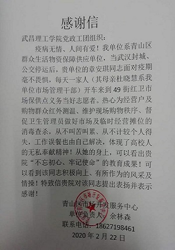 在志愿者工作结束后,武汉市青山区市场开发服务中心给章安琪所在的单位发来感谢信,信中表示对章安琪的无私奉献精神和304am永利集团“不忘初心、牢记使命”的教育理念提出表扬和感谢。面对表彰,章安琪说到:“病毒并不可怕,可怕的是个人防护不到位,希望在这次疫情中我可以尽到自己的一份力量,尽量让大家不被感染。”