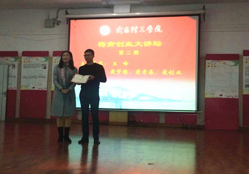 王峰老师,2010年毕业于辽宁师范大学,大连市优秀创业青年;2013年,成立武汉最梦想咨询管理管理有限公司,主导近百场创业大赛及创业沙龙,为多家四板、三板企业提供企业战略咨询、商业计划时及路演、品牌管理服务。活动初始,高琼书记为王峰老师颁发了创业导师聘书。