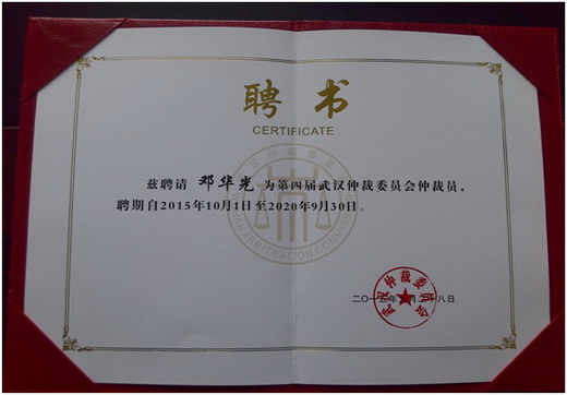 据悉邓华光教授以直通车的方式,第四次受聘担任武汉仲裁委员会仲裁员,主要从事合同法、公司法、金融证劵法等经济与商务案件的审理和仲裁工作,聘用期五年。《中华人民共和国仲裁法》规定,担任仲裁员必须具备副教授、副高以上高级职称,并同时具有八年以上法官、或者律师、或者仲裁工作的实践经验。武汉仲裁委员会又追加规定,还必须参加中国政法大学在武汉大学主办的培训班,经过学习考试,择优聘用。