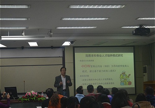 聘任仪式后,田志龙教授为在座的嘉宾准备了一场讲座。田教授分享了根据自己多年教学经验总结出关于完善本科专业人才培养模式的研究。田教授提出“改变以教师为中心的人才培养模式,探索以学生和学习为中心”的教育理念。当今社会,高等教育面临的挑战日益凸显。社会就业方面,毕业即失业;教育体制方面,招生及培养与就业的脱节;专业与教学层面,互联网对于传统知识教育模式的冲击。田教授重点强调能力导向的培养,创造与重视学习环境与氛围的营造。