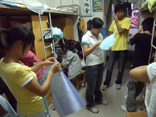 5月19日晚上6时30分,国贸0802班女生齐聚男生寝室,为男生装扮寝室。女生非常积极认真,提前“勘查了地形”,并准备了许多装饰材料。大家齐动手,剪纸,画画、整理有条不紊地进行。随着墙纸一张张被贴在门上,一幅幅可爱的画面出现在寝室里,男生寝室一改往日的沉寂,顿然焕发出靓丽温馨的色彩。
