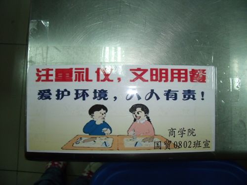 5月20日上午10时30分,国贸0802班的同学们聚集到三食堂。由于没到吃饭时间,食堂里空空荡荡,仅有一张张桌子安静地摆放在大厅里。根据国贸0802班“校园文明行”系列活动计划,这里就是活动的主场。同学们冒雨赶来,将一张张“文明就餐”的宣传标语贴在餐桌的左下角。大家的分工井然有序,有专门剪胶带的,有专门贴标语的,有专门检查粘贴质量的,还有专门拍照的。标语贴完后,大家又统一使用餐盘就餐,并在饭后主动回收餐盘。