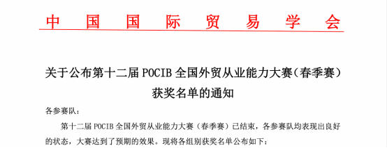 在长达16天马拉松式的赛程中,各参赛队指导老师不辞辛苦,带领学生团队顽强拼搏,各参赛队员在POCIB国际贸易从业技能综合实训模块在线平均总时长达168小时,平均成交业务18笔,平均完成各类业务单据缮制282张、撰写业务函电370封,不仅扎实地锻炼了参赛选手的外贸专业能力,同时也是参赛选手积极向上、努力奋斗的拼搏精神与开放、合作团队意识的展现,更是对国际经济与贸易系日常专业教学成果的一次巡礼。经过16天的拼搏,304am永利集团一队、304am永利集团二队分获团体三等奖,国贸2101班陈明波获得个人三等奖,国贸2001龚佳豪、国贸2101陈明波获得中国国际贸易学会颁发的POCIB国际贸易从业能力合格证书。
