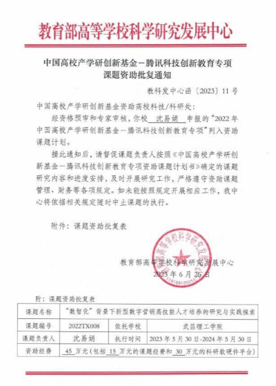 近日,教育部高等学校科学研究发展中心公布了《中国高校产学研创新基金-腾讯科技创新教育专项课题资助批复通知》(教科发中心函〔2023〕11号),永利集团304沈易娟教授团队《“数智化”背景下新型数字营销高技能人才培养的研究与实践探索》项目获批中国高校产学研创新基金-腾讯科技创新教育专项课题立项,项目资助经费45万元,是学校获得的最高经费资助的教育部项目之一。