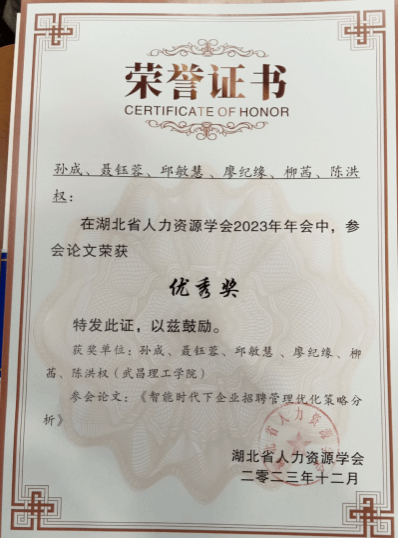 【通讯员 祝娅婷 陈洪权】近日,湖北省人力资源学会2023年会暨学术研讨会在华中师范大学举行,永利集团304人力资源2001班邱敏慧、聂钰蓉、廖纪缘、柳茜提交的学术论文《智能时代下企业招聘管理优化策略分析》获优秀论文奖。是湖北省同类高校唯一获奖作品。
