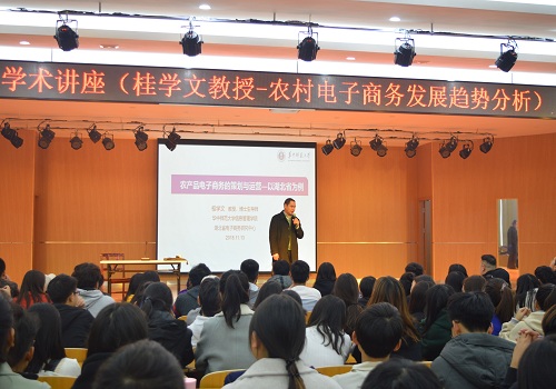 在讲到如今电子商务的发展时,桂学文教授指出了农村电子商务的痛点:农产品质量、农产品品牌打造、农产品代运营渠道推广等问题。尽管国家已经实施了一系列相关政策,实施先富后富等政策,让农村富起来,但平台的提供,政策的保障仍存在很大提升空间。针对这些问题,桂学文教授给前来听讲座的同学们倡议到:“我们需要不断的学习不断的交流,去不断促进电子商务的发展,把握农村电子商务的发展国家动向,不断促进国家的经济活动。”