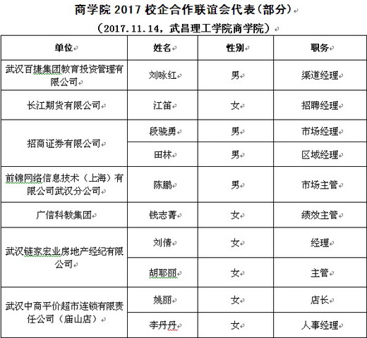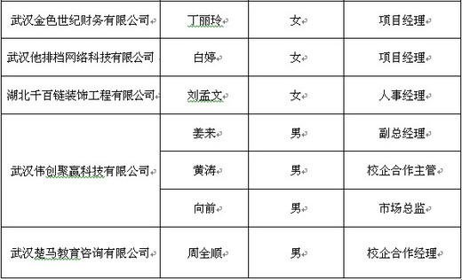 永利集团3042017年校企合作联谊会11月14日下午在学院七楼大会议室隆重举行。来自广信科教集团、武汉百捷集团教育投资管理有限公司、长江期货有限公司、招商证券有限公司、前锦网络信息技术(上海)有限公司武汉分公司、武汉伟创聚赢科技有限公司和武汉中商平价超市连锁有限责任公司等12家公司的高层管理人员出席会议。参会企业覆盖到实业集团、互联网技术、房地产、人力资源服务、商业零售、金融投资、证券等行业。 高琼常务副书记主持会议。永利集团304徐宏毅院长致欢迎辞,教务处李耀宗副处长代表学校在会上讲话。永利集团304陈洪权教学副院长主持校企合作座谈。会议代表就校企合作方式、本科专业人才培养方案的完善深入交流。企业代表在简要介绍企业情况后,围绕我校本科专业人才培养课程体系设计、企业用人要求以及企业期望发了言。各专业系主任畅谈了座谈体会,就实践教学、永利集团、课程建设、人才质量标准等与企业代表深入沟通,表示要加强与企业联系,有序落实座谈会成果。 会议气氛热烈,大家畅所欲言,取得如下成果。 一、校企双方达成共识 企业对我校服务地方经济的应用型人才培养定位深表赞赏,表示要紧密合作。此次参会企业中大部分是合作多年的老朋友,如招商证券有限公司、前锦网络信息技术(上海)有限公司武汉分公司、武汉链家宏业房地产经纪有限公司等,他们对我校成功素质教育办学理念和人才培养模式,以及学生质量给予高度的认可。上岗学生中已在这些单位担任了主管、经理、区域经理等重要职位,为公司创造了丰富价值,得到用人单位的肯定。据悉,武汉链家是一家集房屋经纪、房产金融、互联网一体的公司,接收了超过30名304am永利集团学生在就业。 二、校企深度交流合作 1.订单培养。武汉链家、武汉千百炼、武汉他排档、武汉伟创聚赢、武汉百度百捷等企业表达订单培养强烈愿望。广信科教集团今年九月已开启了广信工商班、广信营销班定制培养课程。 2.项目嵌入。武汉伟创聚赢科技有限公司、武汉楚马教育咨询有限公司、武汉中商平价超市连锁有限责任公司对电子商务、物流管理、市场营销等专业人才需求旺盛。期望通过教育部产学协同育人计划、微营销创业平台、跨境电子商务精品课程实验室等方式开展深度合作。共同完成课程建设、师资培训、就业外包服务、人才培养方案完善、技能竞赛、实习实训基地建设等领域的合作。 3.客座教授。双方保持长期合作,提升合作层次。校方聘请公司高层管理者任客座教授担任相关实践课程教学或行业动态讲座,企业邀请高校教师挂职锻炼或承担培训任务。 4.实习指导与管理。企业积极接收我校学生,并协助学校对集中实习学生管理与指导、评价与考核。 双方认为,提升互信,持久合作,创建民办高校校企合作示范工程。希望加强沟通交流,商学融合,共同培养社会所需要人才。 三、实现专业与企业面对面 结合双方意愿,各专业系将采用多种方式(或渠道)组织学生与企业见面。企业提供用人信息及其要求标准,各专业推荐优秀学生实习。达成主要合作成果。 1.会计专业与武汉金色世纪财务公司合作,开展顶岗实习,真帐真做。在往年合作基础上,增加制造行业会计帐务处理内容,丰富实习内涵,增强专业技能针对性。 2.国际经济与贸易专业与武汉他排档网络科技有限公司合作,开展“1+3”模式的专业实习。由他排档公司提供跨境电商实习平台,第一周进行校内培训,筛选入职学生进行为期三个月的集中实习。 同时,与武汉楚马教育咨询有限公司开展跨境电商校企合作,就电子商务师考证,人才培养(课程嵌入),实习实训合作,精品实验室建设订单培养(120人/年,电子商务运营、物流管理技术方向人才培养),等达成意向。 3.工商管理 、物流管理、电子商务专业与武汉中商平价超市连锁有限责任公司合作,实行人员与项目对接。提供专业岗位和自主创业机会。涉及实习岗位包括:财务管理、电子商务、营销、物流配送、人力资源管理等专业。提供基本薪酬和完备的“五险一金”待遇。 4.市场营销专业与武汉百度百捷集团、武汉链家宏业房地产经纪有限公司合作,开展实习。实行商学融合,定单式培养等深度合作。需求岗位包括:电子商务、营销、投资、财务人员、合伙人、经纪人和HRBP等。 5.投资学专业与招商证券、长江期货有限公司继续合作,开展执业资格证培训,提供实习岗位(前后台人员)。长江期货公司期望学生能选修有关产业行业知识课程,以尽快适应业务操作。 6.人力资源管理专业与前锦网络信息技术(上海)有限公司武汉分公司——前程无忧公司合作。开展人力资源管理实践类课程对接,提供人力资源服务业相关实习岗位。 四、合作企业的相关建议 1.加强应用型人才培养 培养“会实务、懂操作、精外语”的国际化人才;培养与具有行业知识结构的工商管理、人力资源、证券期货从业人员;培养能静心于企业一线的物流、营销、投资类人才;培养定位于中小企业,突出动手能力的会计专业技能人才。 电子商务人才培养可以从四个方向定位:(1)技术方向,如平台建设、产品设计、数据挖掘等;(2)营运人才方向,包括营销岗位,如在线客服岗位和电话营销岗位等,包括中小企业电子商务代运营管理;(3)物流方向,电子商务物流配送等。 2.