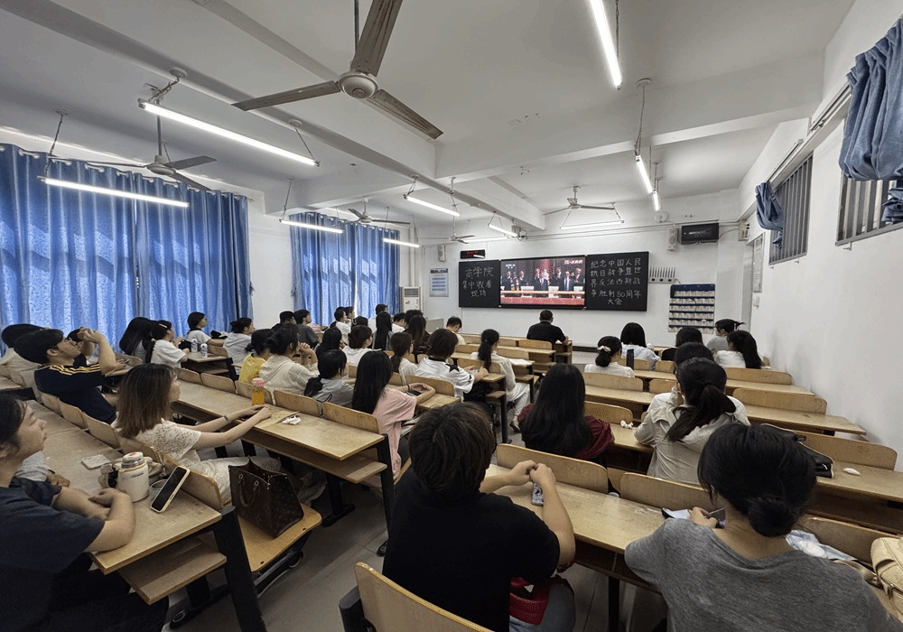 通过观看此次大会师生们受到了一次深刻的精神洗礼,这是一场国家力量的庄严展示,更是一堂震撼人心的爱国主义教育。观看结束后,来自第四党支部的成员王舒瑾表示:“历史承载着过去,也启迪未来。今天的大会上,人民用嘹亮嗓音唱响国歌,礼炮的响声一声声地传来,让阳光在天安门上发出光芒。作为新时代的大学生,我们应铭记历史,学习传承红色精神,珍惜和平的来之不易,努力为中华民族伟大复兴贡献力量。新时代,新征程,历史长河川流不息,伟大旗帜永耀千秋,正义必胜,和平必胜,人民必胜。