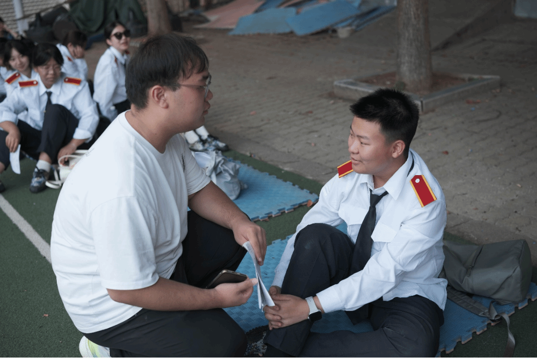 为更好地服务军训,永利集团304团委组织学生骨干全程陪伴在军训场上。他们不仅协助教官维持训练秩序,还主动为同学们送水、提醒注意防晒,并耐心倾听新生的困难与诉求。休息间隙,骨干们与新生拉家常、分享校园生活经验,帮助他们舒缓紧张与疲惫情绪,让新生在烈日与汗水中感受到来自学院的关怀与温暖。
