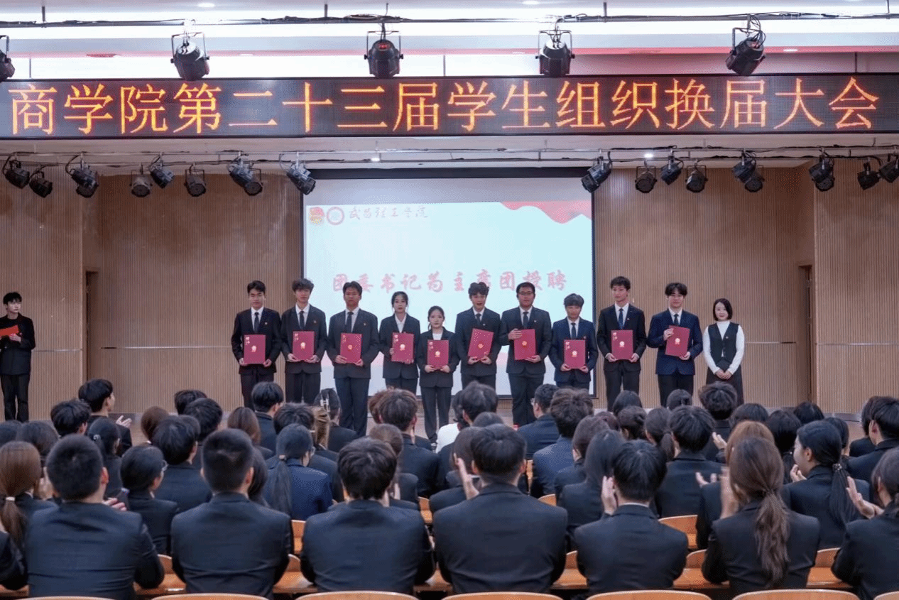 大会伊始,熊文悦书记致辞,充分肯定第二十二届学生会在校园文化活动策划、秩序维护等工作中的贡献,强调“服务同学、锻炼能力、提升自我”的核心宗旨,并对新一届学生骨干提出四点要求:强化服务意识倾听同学诉求,注重团队协作推动高效协同,勇于创新形式贴合学生需求,平衡学业工作做好模范表率。随后,第十四届学生会执行主席闫小宇作述职报告,总结过去一年通过“商苑青年说”“梅南之星评选”挖掘特长学生,举办“新生杯”球赛、元旦晚会等活动,组织“电商助农”志愿服务,依托创业实践部斩获十项省重点项目,并通过权益会、心理解压等活动保障学生权益。