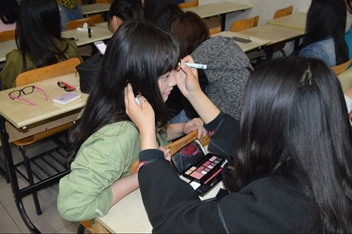 每周四晚上六点半,永利集团304602教室总是显得很热闹,原来,这正是形象塑造课程的进行时。有时教室前方会坐一名同学,接着老师站在边上为她化妆。老师一边化妆一边讲解,同学们看得聚精会神,然后学着为身边同学化妆。