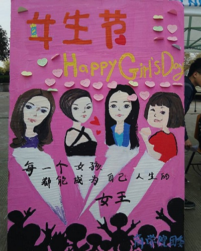 除了在留言板上留言和派发浪漫温馨卡片,女生部在女生宿舍给女生们也送去了温馨的问候:东五宿舍楼底下的黑板上在清晨已写好了祝福语和萌萌哒女生部的天气预报、心灵鸡汤以及生活小常识。在东区便利店附近的两棵大树下也早早挂起了“世上女神千千万,商院女生占一半”的标语,引得不少女生都感叹到标语太霸气了。