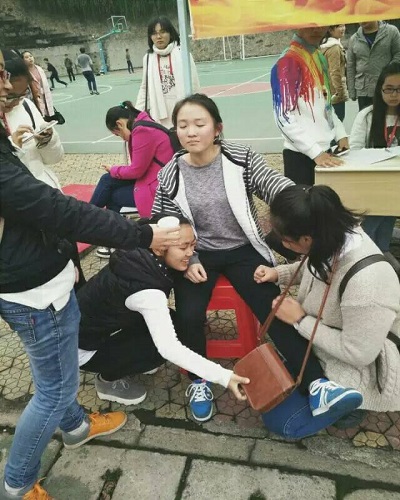 记者了解到,在整个比赛过程中,她也接受了很多帮助。在赛前,她的同学们为她送水给他加油。比赛时,同班的同学们为她呐喊助威,和她一起跑的队友在她跑不下去的时候也拍了她一下激励她。赛后,有很多人照顾她,扶着她,给她按腿送水。还有同学为她送感冒药和牛奶。为此她感到很幸福,很温暖。