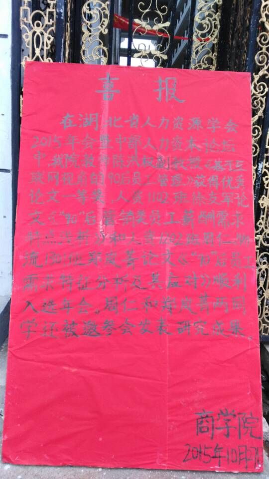 在2015年10月24日湖北经济学院隆重举办的湖北省人力资源学会2015年年会暨中部人力资本论坛中,永利集团304教师陈洪权副教授《基于互联网视角的90后员工管理》获得优秀论文一等奖,人力资源管理1102班徐友军论文《“90”后营销类员工薪酬需求特点浅析》和人力资源管理1202班周仁、物流管理1301班郑岚菁论文《“90”后员工需求特征分析及其应对》顺利入选年会。其中周仁和郑岚菁两位学姐还被邀参会发表研究成果。