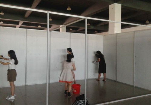 说干就干,大伙儿们的积极性处处可见。个子相对较高的男生拿着小铁铲铲掉紧贴在墙上的厚胶带,然后用砂纸磨平胶带的痕迹,接着用抹布一擦,一块崭新的墙就出现在我们眼前。女生则拿着扫把把地面的垃圾打扫的干干净净。在大家的积极配合下,一个小时左右的时间,干干净净的成功素质展示区浮现出来。