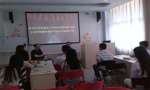 经过前期一系列的活动筹备,2015年4月29日,在三源特种建材有限责任公司招聘组经理刘振兴的指导和帮助下,“三源班”一行12名同学于十点钟集合在校门口,等待三源公司派出车辆接送同学们到达公司进行参观学习。
